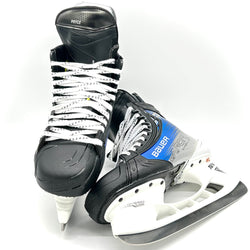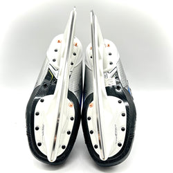 New Bauer Vapor Hyperlite 2 skates from an CHL team. Size 9.5E with 280 Tuuk LIghtspeed Edge holders and Fly Ti steel. These skates come in a custom blue colourway and have the name "Pryce" printed on both tongues.