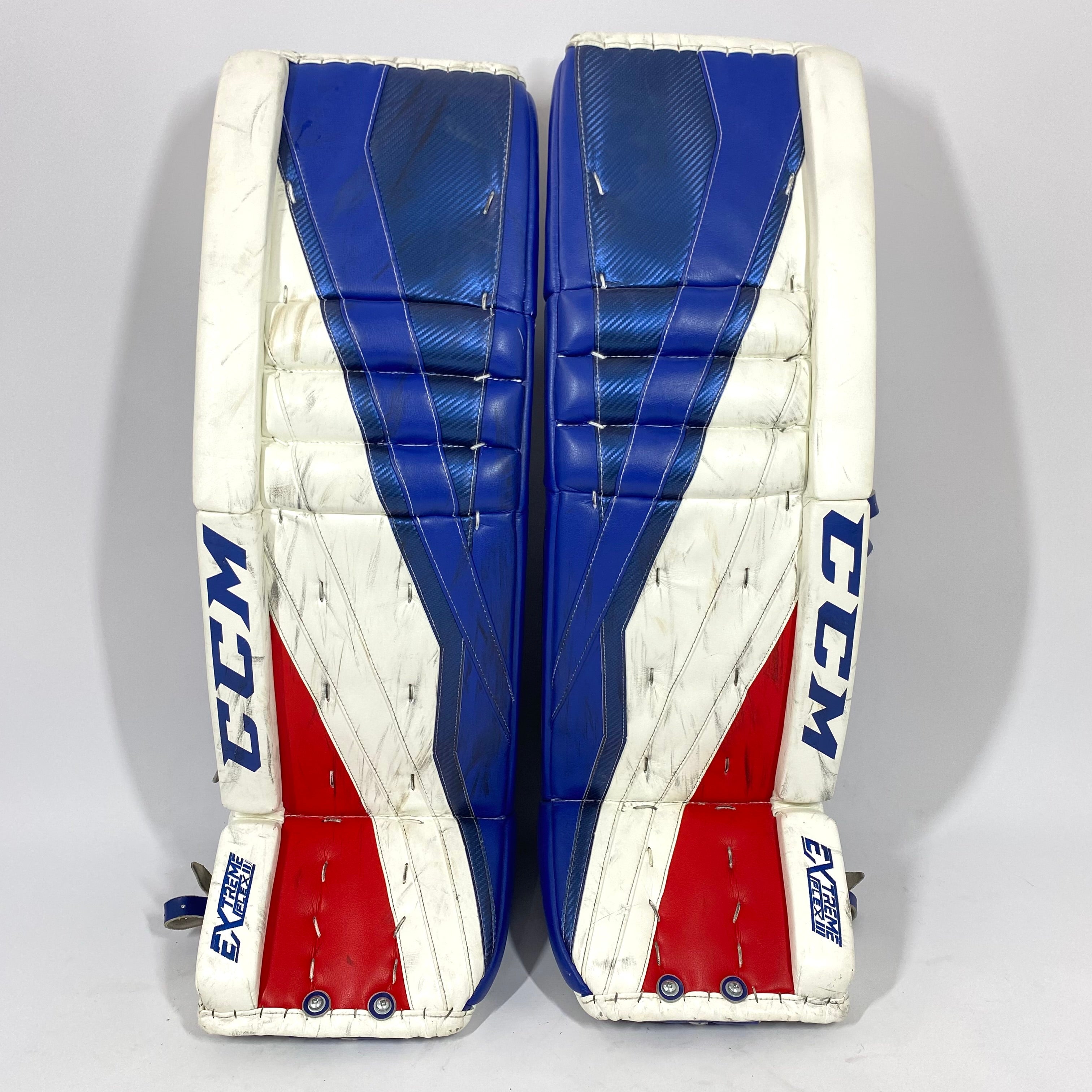 CCM Extreme Flex III - Used NCAA Pro Stock Senior Goalie Pads (White/Blue/Red)