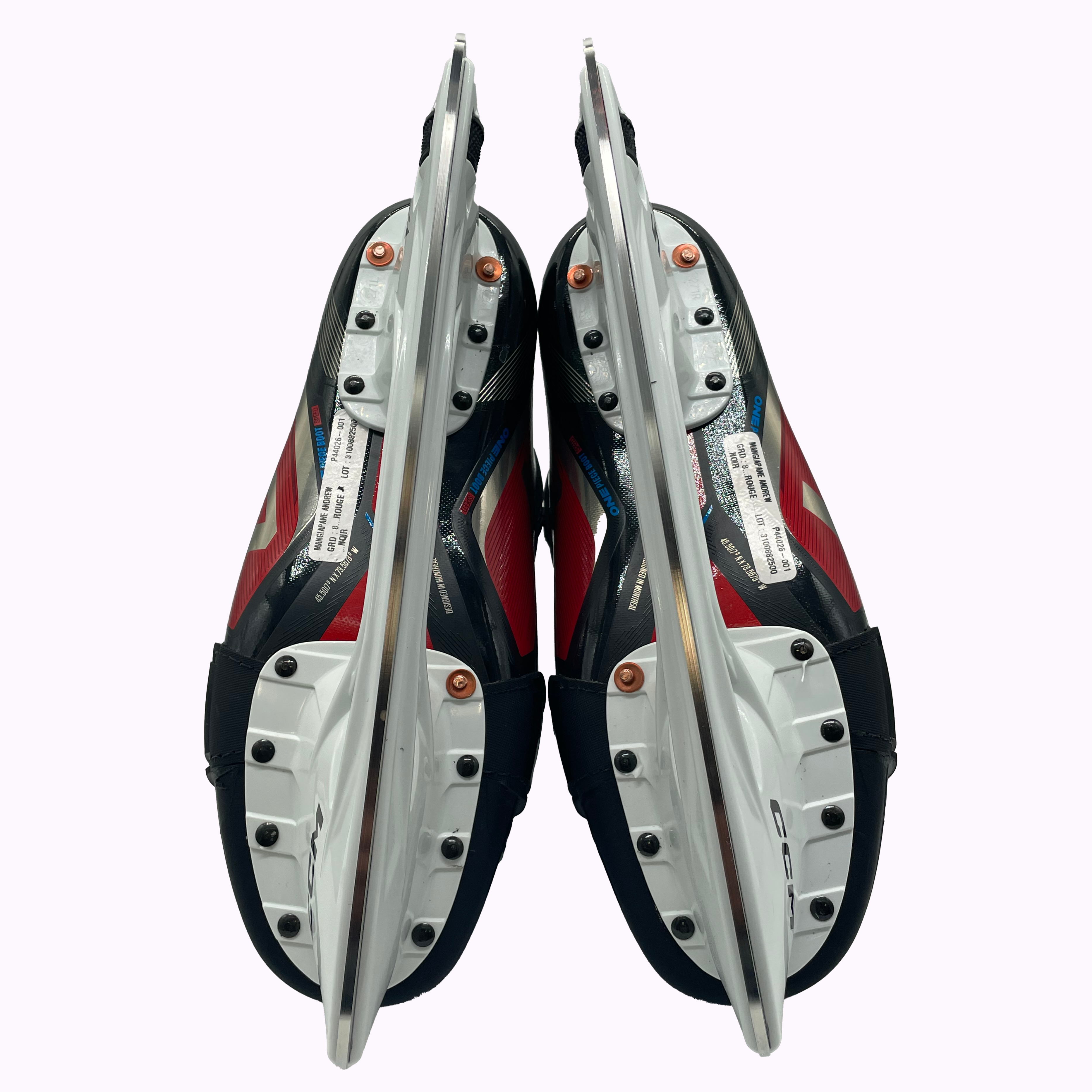 CCM Jetspeed FT6 Pro hockey skates from Andrew Mangiapane of the New Jersey Devils. Size 8D with 271 XS holders and CCM Step steel. The skates feature the players number on the tongue as well as the heel of the boot.