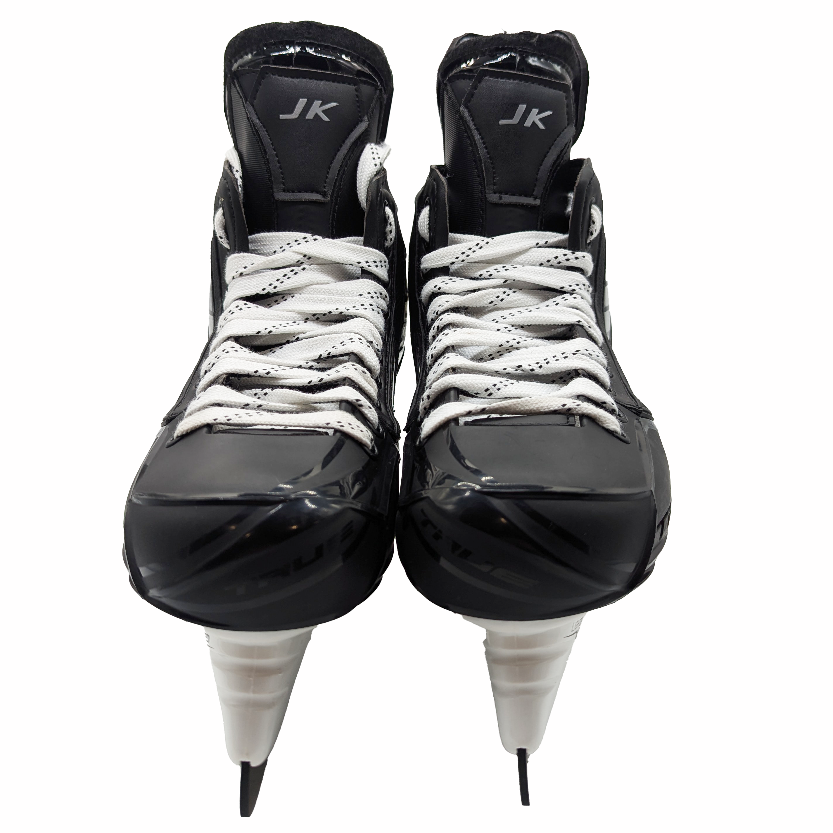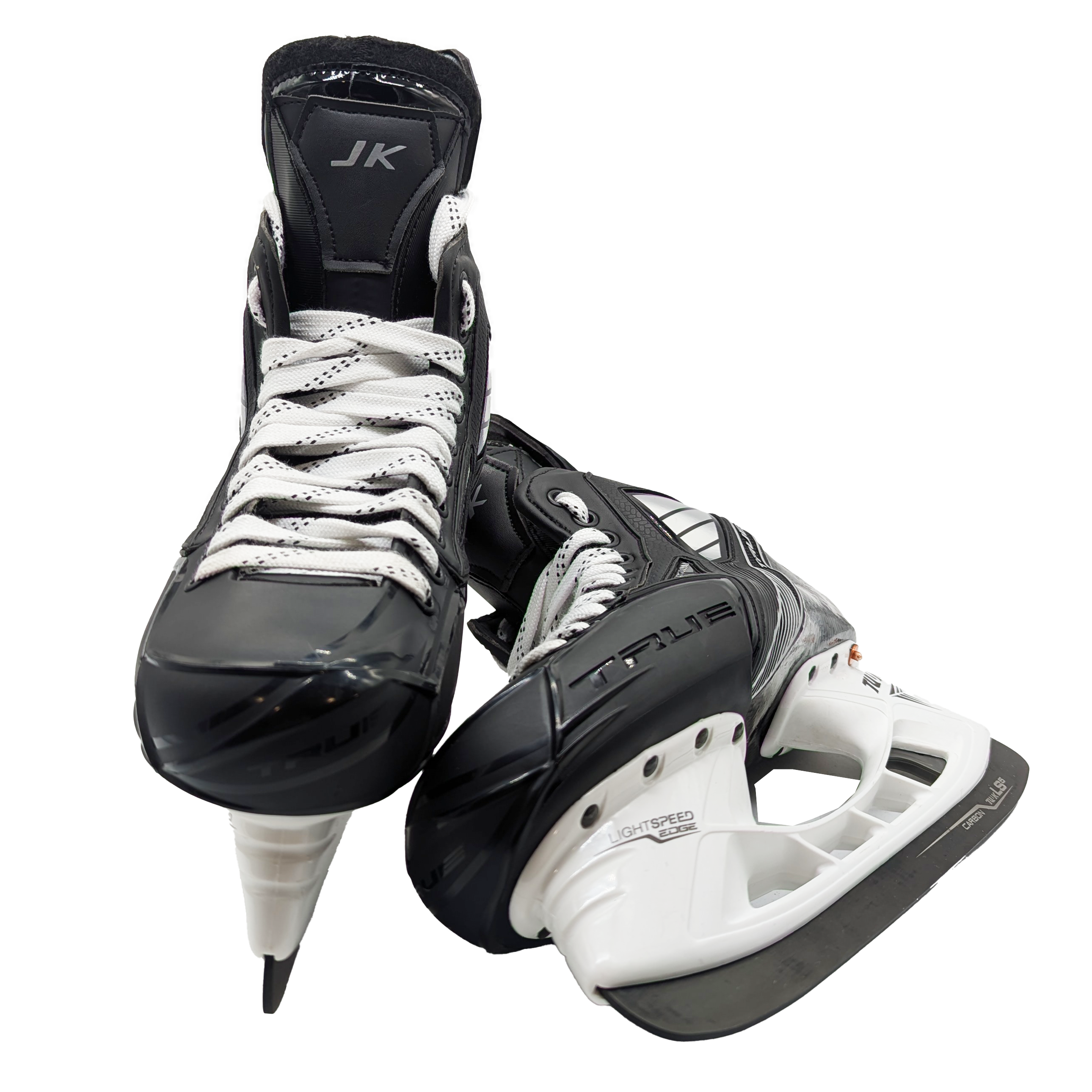 New True custom hockey skates. There is no size listed but have size 8 insoles and 272 Bauer Tuuk Lightspeed Edge Holders with LS5 Steel. These skates also have the initials "JK" printed on the tongue.