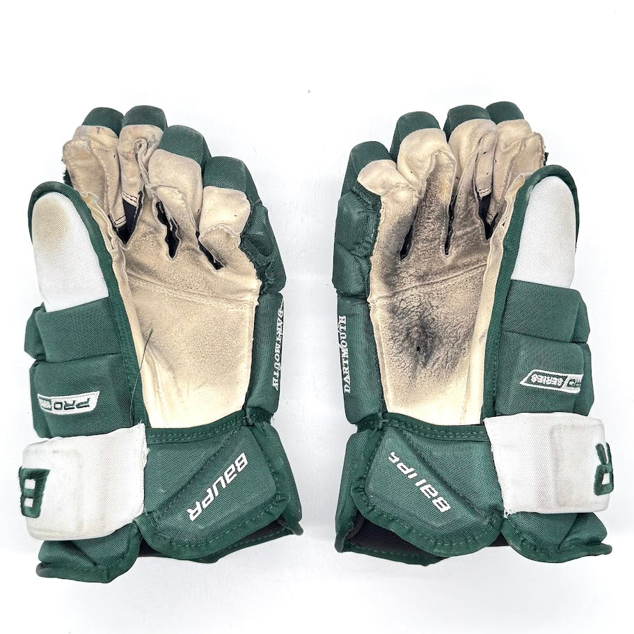 Used hockey gloves from Dartmouth University in the NCAA. These gloves are in good used shape with no tears and very little wear marks on the left glove. the right palm is in fair condition with one small hole. “Dartmouth” stitched into the side of the glove.